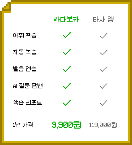 기능이 많고 구독 비용이 비싼 시중의 앱과 다르게, 꼭 필요한 기능으로만 합리적인 가격으로 영어 학습을 할 수 있는 앱입니다.